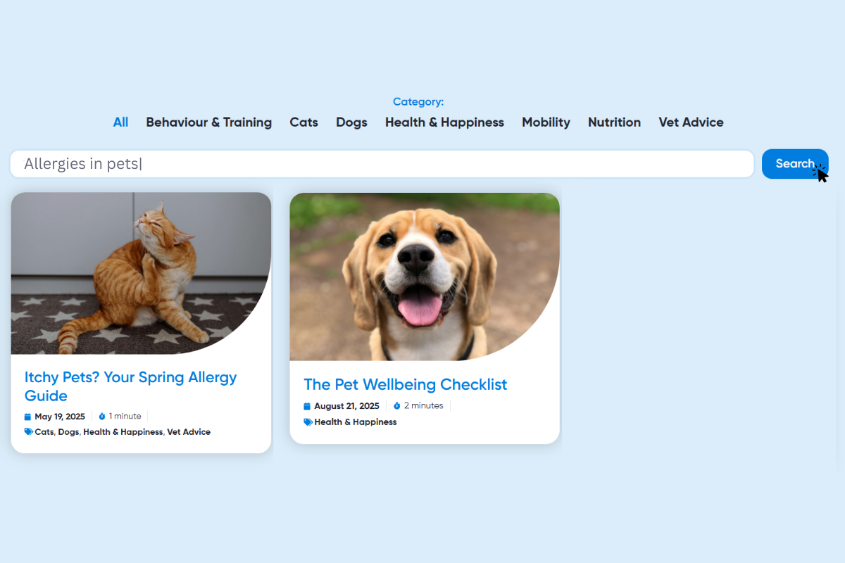 You can explore topics by species or by area of concern, making it easy to find the advice most relevant to you and your pet. Over time, we hope to build a rich library of online vet advice and resources you can return to again and again.